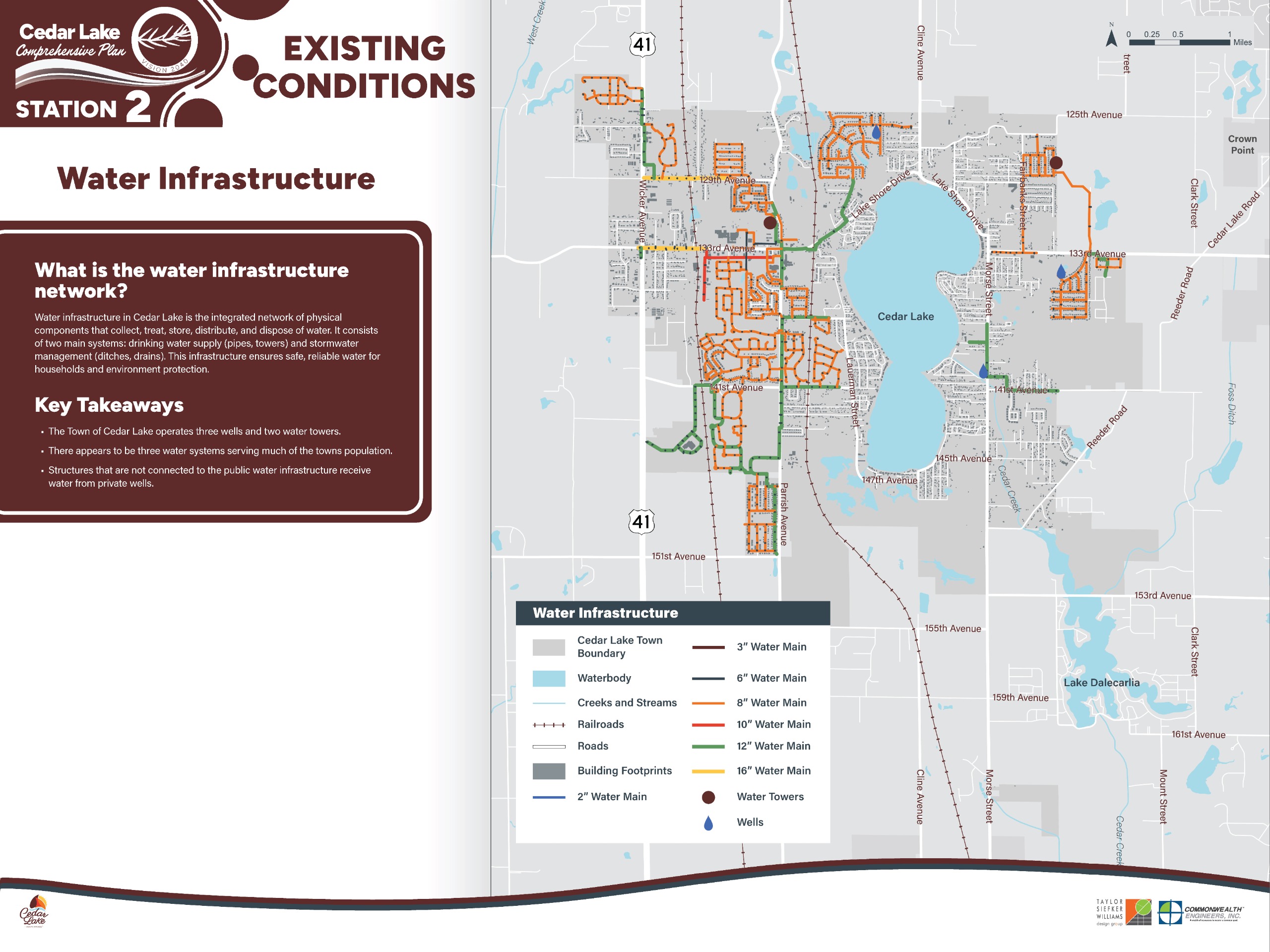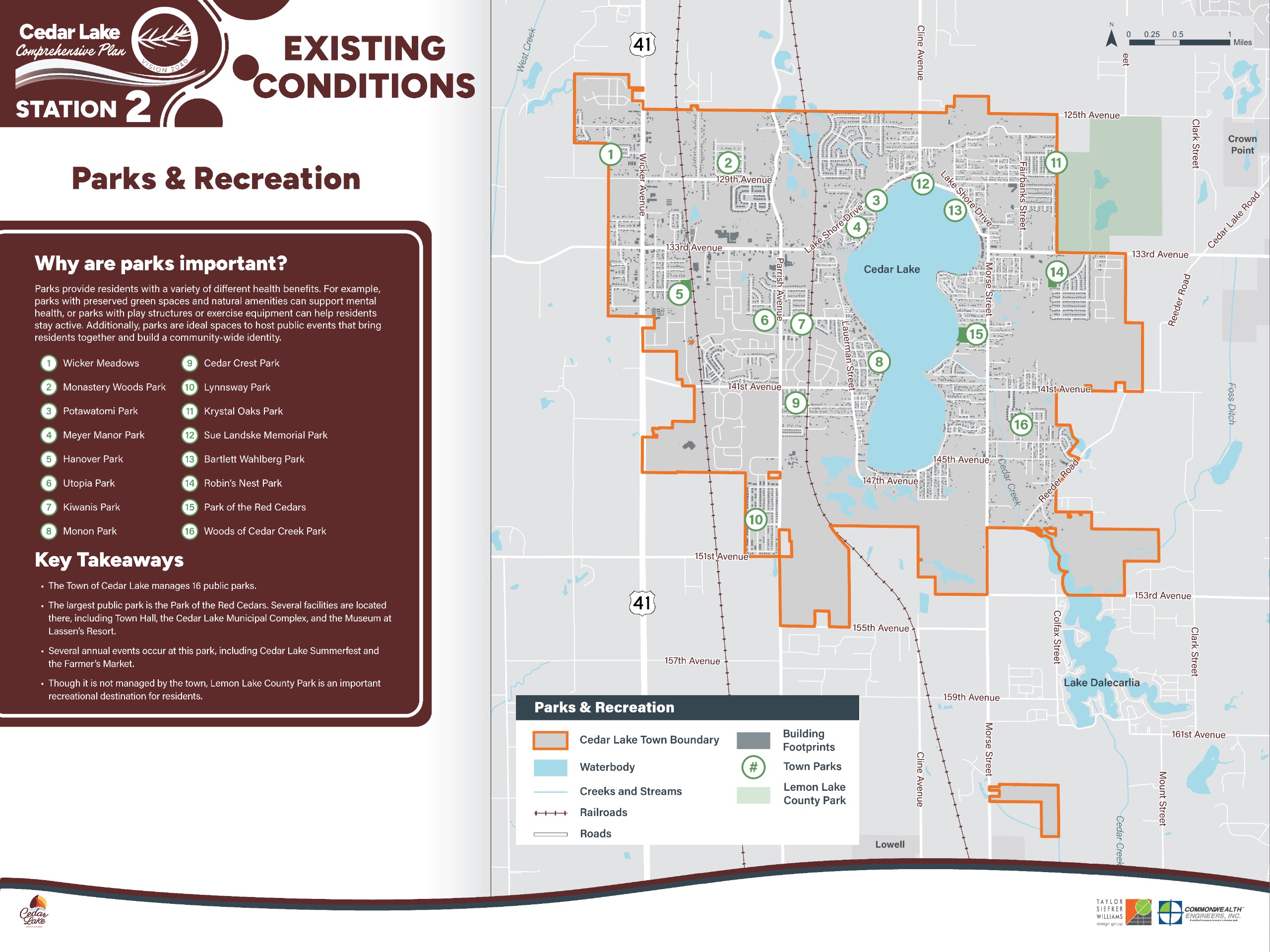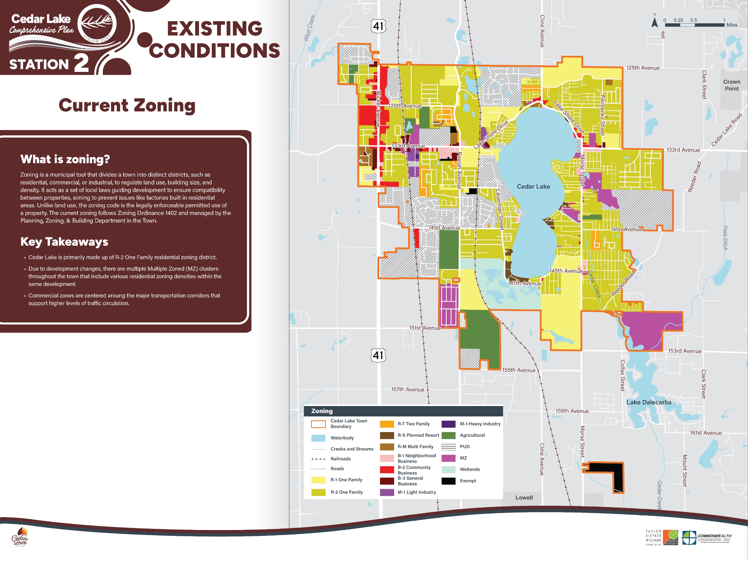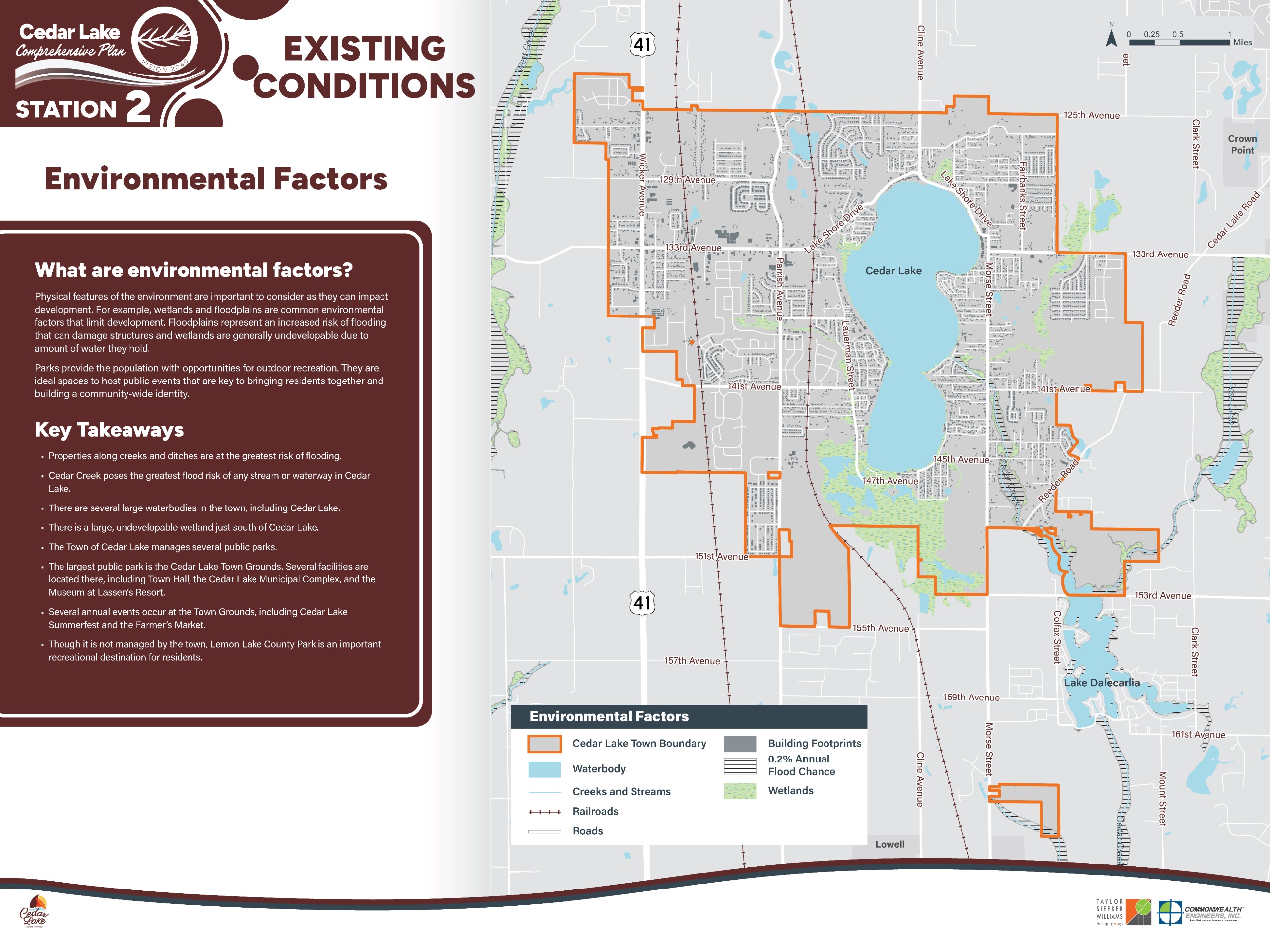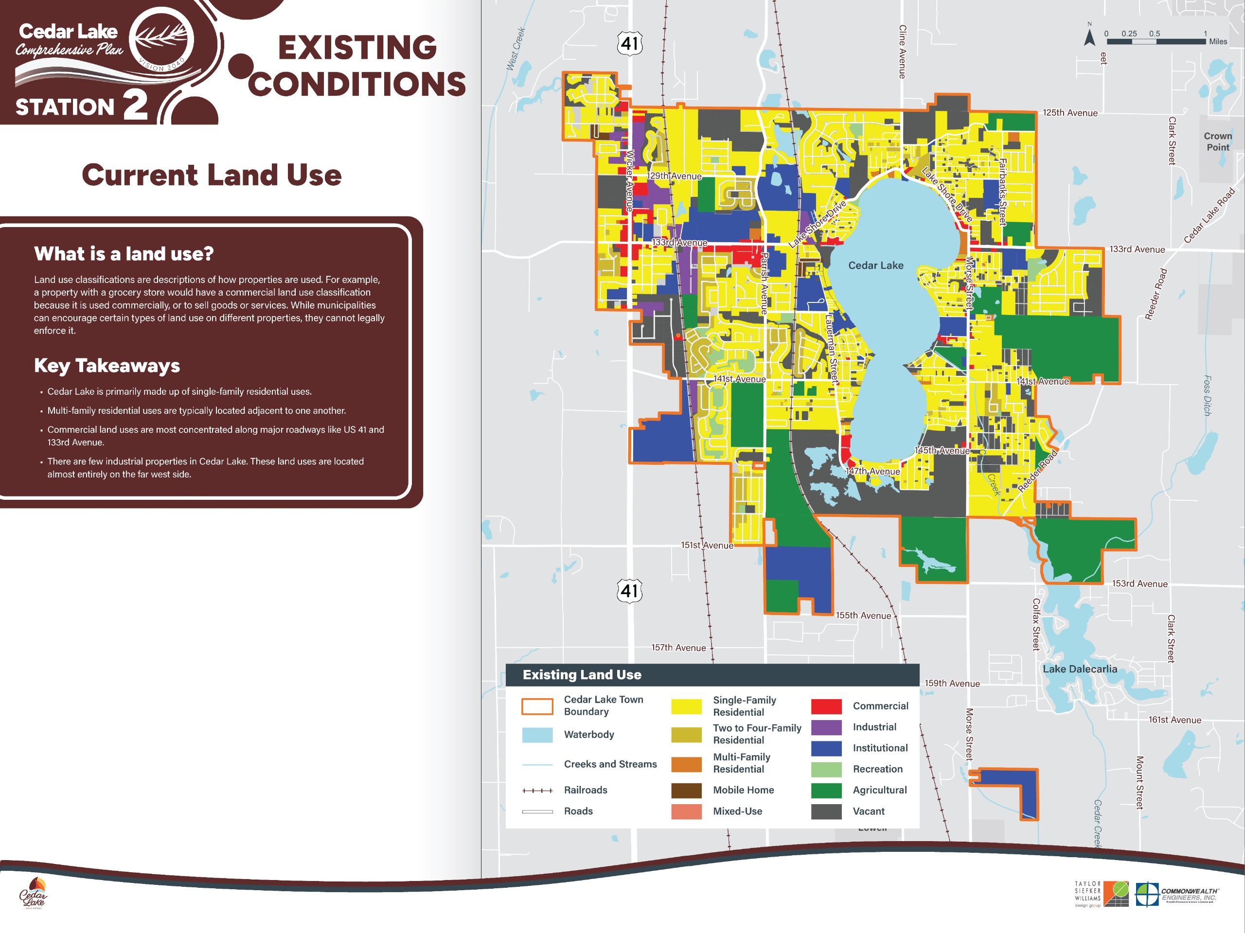 Two public open houses were facilitated at the Cedar Lake Municipal Complex (New Fire Station) on Wednesday, April 1, 2026. Attendees were provided a background of the comprehensive planning process and existing conditions summary. In addition, participants had an opportunity to provide feedback to help guide the visioning process. This feedback will be utilized as part of the foundation for plan priorities that will be developed in the second phase of work. Attendees were also encouraged to complete the online survey and share that survey information with others in the coming weeks.
